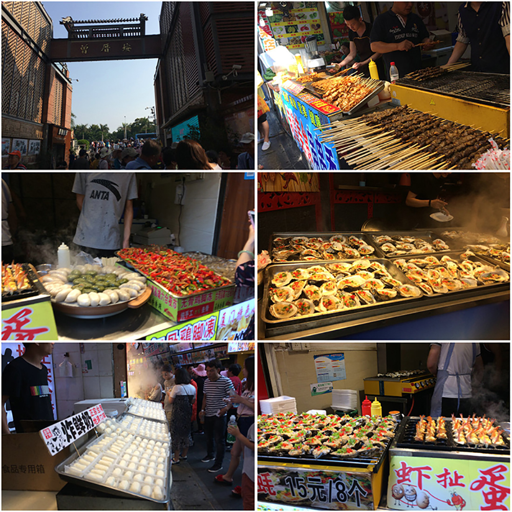 抵达曾厝垵,进门的牌楼早已是游人如织。步行进入小巷里,游客密布各色小吃美食云集沙茶面、生蚝、蚵阿煎、虾扯蛋、炸鲜奶、烧烤、冰淇淋,不愧为吃货最爱的胜地之一。曾厝垵是极具代表性的闽南原生态自然村,"五街十八巷"的阡陌小巷遍布风格各异的民宿客栈。