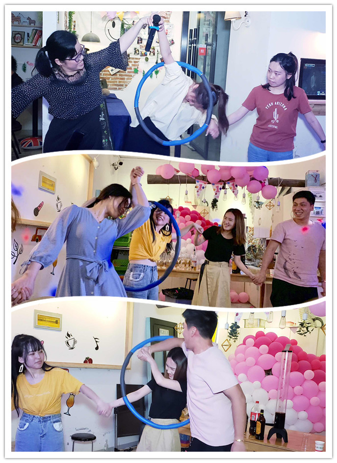 大家手牵手传递呼啦圈,用身体穿过去,不能用手,而且每传完一次,呼啦圈都会减小一圈,难度系数4颗星。