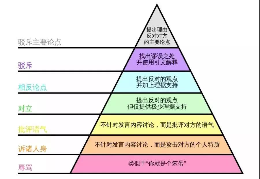 硅谷创业之父 Paul Graham,在一篇文章 How to disagree 中,提出过一个经典的「反驳金字塔」(Hierarchy of Disagree):