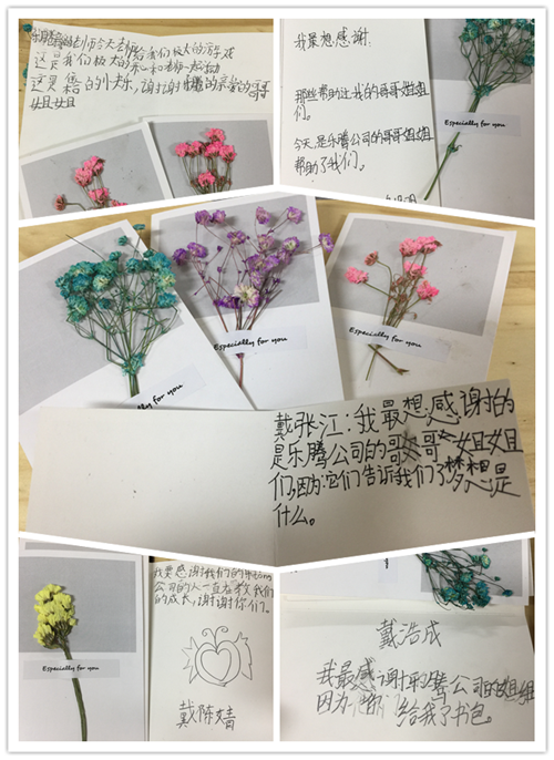 “我最想感谢的是乐腾公司的哥哥姐姐们,因为他们告诉我们了梦想是什么”这是来自杏岙小学学生写给乐腾的信卡。