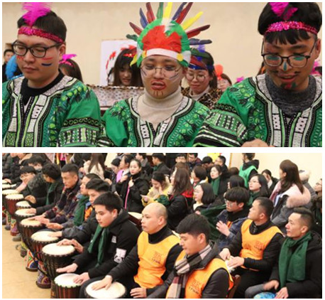 晚饭过后的击鼓环节大家玩的很嗨,边击鼓边唱歌边摇头晃脑,原先局促的场面,因为音乐的存在,大家放开了很多。一百多号人一起发出的击鼓声震耳欲聋,力往一处使就是这样有震慑力。姐夫就是大家的核心,他助跑,我们呐喊,他举手示意停,我们戛然而止,妙哉~