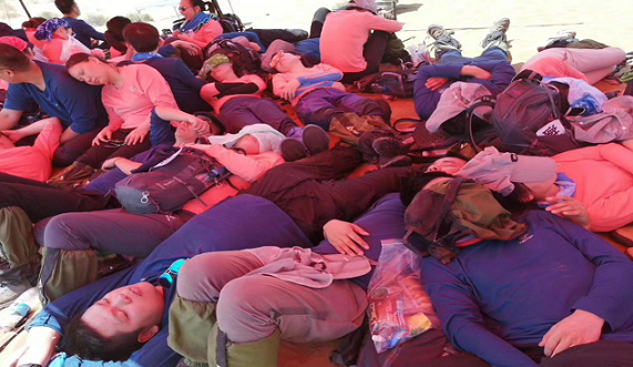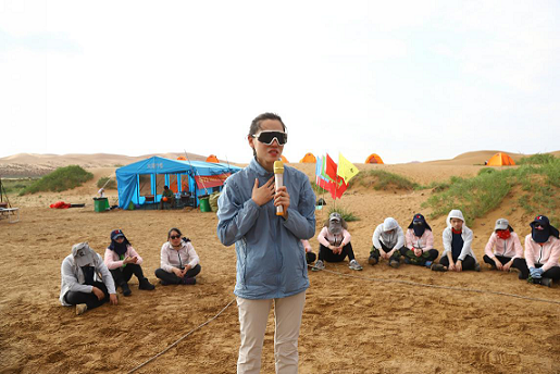 凌晨5点多所有人一起爬上去看日出,到达营地,搭帐篷,吃早餐,而后休息补觉。太阳太猛,又认床,我根本无法入睡,顶着太阳闷在帐篷里眯着眼睛听着此起彼伏的呼噜声~~一方面心里想着,这么大的沙漠,这条路线,开发的人真的太牛B啦,总感觉这么一望无际的沙漠,如果没有他们带领着我们来这里,那么我是万万不敢踏进来的,我深知大自然的力量很强大,我很敬畏大自然,也很恐惧在大自然中的那种无助。意识里有三天要呆在沙漠里,总感觉离开沙漠的那一刻很遥远,第一天让我感觉很漫长,可能因为我个人喜欢在任何时刻都把时间充分利用,可能因为第一天白天大家在沙漠里自由安排,白天没有特别有意义的事情,我当时感觉时间这样浪费有点遗憾,当时的我有点小抱怨,抱怨时间不该这样浪费。但是,当晚饭时刻,教练给我们安排了拉绳子活动,这个活动深深的打动了每个人,意义非凡,我的小抱怨也是随之烟消云散~~