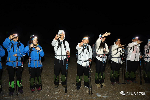 刚出发大家都比较激动,慢慢的我有点跟不上前面的脚步了,风沙太大,因为出发时我没有带上帽子和魔术巾,眼睛睁不开,耳朵里全是沙子,生怕沙漠回去自己会不会得耳膜炎,也庆幸自己还好没有带隐形眼睛,但是我不敢停下脚步,硬着头皮,闭着眼睛往前走,尽量不让自己掉队。走过平路之后,开始循坏的爬上坡和下坡还有脊背,因为头灯带的不规范看不见眼前的路,也因为恐高走在脊背上的时候两脚发软, 那一刻,胆小的自己很害怕,我不知道沙漠里的坑到底深不深,摔下去能不能爬起来,每一步都是踩得死死的,登山棒握的紧紧的,加上那时风特别的大,生怕一不小心就会掉金沙里去。另一个自己告诉自己,没事的,加油!大家都能行,那么我也肯定行。庆幸那时经理和老板娘走在我的后面,经理一直把走上下坡的方法和经验告诉我,后来慢慢的领略了,风沙也小了,瞬间觉得难度系数从100降到了60,我感觉的渡劫结束了。刚被分到跟老板和老板娘同一队时有点压力,后来感觉太幸运了,方法比努力重要100倍,如果没有经理指导方法,那么那天夜行我应该是狼狈至极,只是一路上吃了满满的狗粮。夜行过程躺在沙子上抬头看见星空那一刻,那么美的星空,那么美的银河,感觉太美好了~~