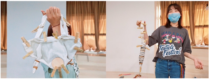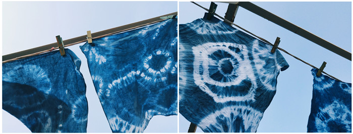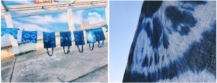 晾晒在天台上的方巾和帆布袋随风飘舞,每一个作品都构思巧妙图案别致,令人赏心悦目,大家纷纷围观点评,欣赏彼此的艺术想象力和辛勤劳动的成果。