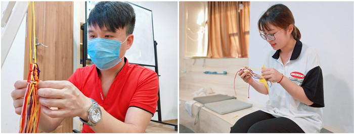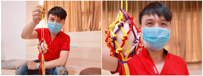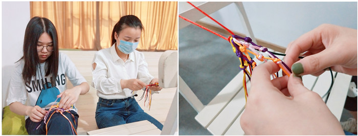 编织蛋袋的方法很多小伙伴都会,不会的小伙伴在梦妮的指导下很快能上手操作,但是由于有两种不同类型的绳子,蛋袋中心区域在制作时会容易把握不准大小,还出现了做好的蛋袋放不下鸡蛋的意外情况。好在乐腾心灵手巧的小伙伴很多,后续做出的蛋袋没有再出现这样的情况。大家发挥自己丰富多彩的想象力,运用大胆的配色和朴实的技巧做出了一个个匠心独具的作品。