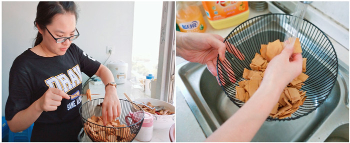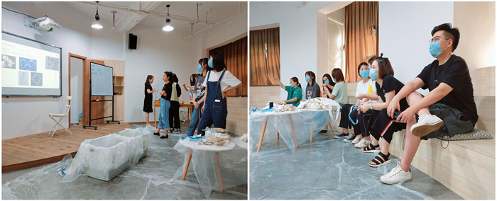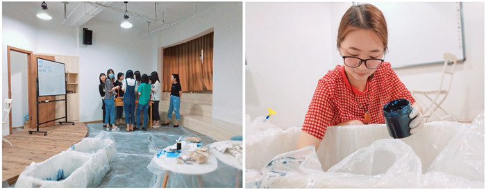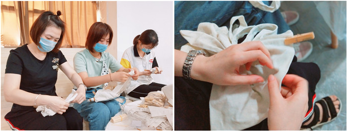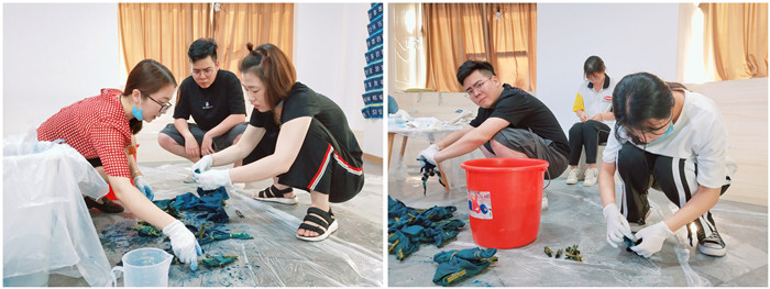 由于扎染扎制的方法多种多样,娟娟用5分钟时间向在场所有人讲述了扎染的发展历程并解说了整个流程,陆陆续续有小伙伴过来参加,在不断的解说中大家逐渐明白怎么去扎制小方巾和帆布袋才能得到自己想要的效果。因为这次扎染用的染料是由纯天然植物材料发酵制作成的蓝靛,味道较冲鼻,准备的一次性口罩正好派上用场,还被小伙伴戏称为“正经的扎染实验”。