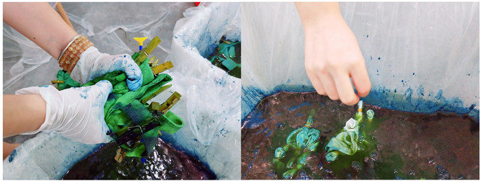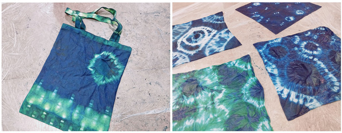 形状各异的木片,粗细不同的橡皮筋,成包的竹夹,大小不一的石子,整齐有序的冰棍条,这些材料就是扎染的所有工具,小伙伴先将小方巾和帆布袋在清水中浸湿,拧干后用不同的材料在织物上“作画”。虽然通过讲解能理解怎么扎制织物,但实际上手时还是会不知所措。好在大家都是摸着石头过河,不同的方法不同的结构变成了一个个变化万千的作品。大家将自己的作品郑重其事地放入染缸,把握好时间,在等待的时间里跑到梦妮带领的蛋袋制作团队中完成属于自己的蛋袋,真可谓是两不耽误。在1号染缸和2号染缸中浸泡的扎制帆布袋和方巾,用时1个小时左右,通过反复2次的浸泡和氧化,基本固色完成。最后一遍的氧化完成后,小伙伴们去除作品上的材料,看着在空气中由绿变蓝的作品,惊讶和欣喜溢于言表。