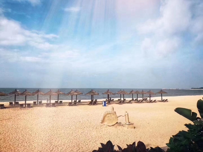 西沙湾酒店没有让大家失望,进入大堂见落地玻璃墙面,沙滩进入眼帘,宁静而安详,只听见一波波的海浪拍打着的声音,天空湛蓝、被阳光染成金色的薄云浮动着。