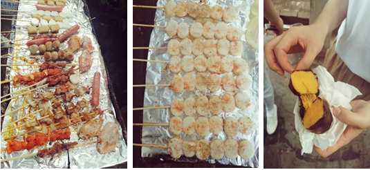 在大家的努力下,香喷喷的美食登场啦!放在锡纸上发出“滋滋滋”的响声,金灿灿的油从烤肉上冒了出来。年糕整齐的排着队,撒上红红的辣椒粉,显得调皮又可爱!刚掰开红薯,一股香气就扑鼻而来,啊!是诱人的味道。