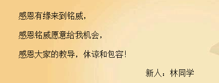 做为铭威的员工,感谢老板和同事们的支持和帮助,在这里工作大家互相学习、认真勤劳、做事踏实,工作氛围开心舒适。老板常常以教育自己的孩子方式打比方来引导我们,这种寄予我们对未来的期盼和希望,让我们着实很感动,能深深体会到老板看重每个员工,都希望每个员工都能成才,希望我们跟着老板一同成长,一同进步。