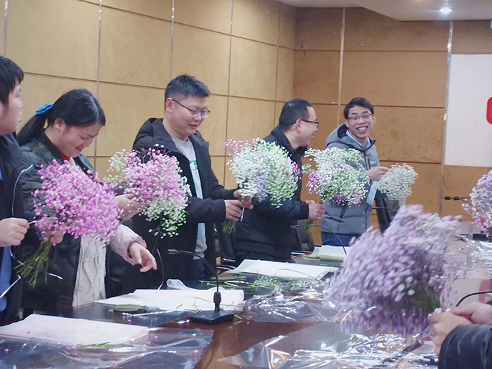 在花艺师的指导下,将枝干剪短至一手卡长。形状不一的彩纸,对半对角折纸既要保持花的造型又要一层层扎紧,也是颇为不易。最后一层彩纸包完打上蝴蝶结就完美收工了。美女花艺师做出来的是花艺,小伙伴们做出来的是造型各异。花艺课在欢声笑语中结束,小伙伴们捧着第一束亲手制作的满天星花束献给各自女神。感谢老板的精心安排,感谢花间·Full Flower美女花艺师的倾囊相授!