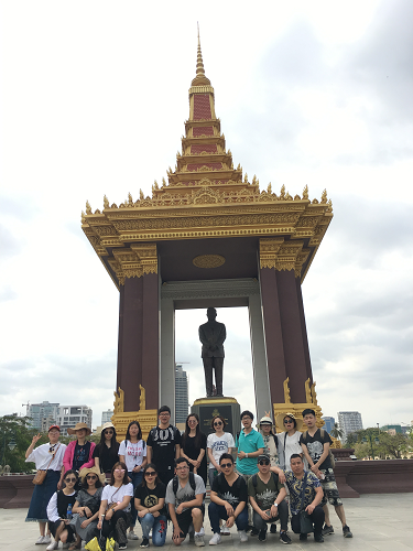 让我们印象最深刻的是当地导游说现任国王是诺罗敦·西哈莫尼至今未婚,每年都会进行选妃活动,可想而知我们的西哈莫尼国王的眼光不是一般的哟~当地导游还科普了我们,如果那天大皇宫里面国旗飘在空中说明他们的皇室在皇宫内,很凑巧我们那天柬埔寨国旗飘的很得劲。但是最后我们参观到最后也还是没有见到哈哈。 之后我们又去了独立纪念碑,这么地表性的建筑怎么会少了我们烁格大家庭的集体纪念照呢~ 欢乐的时光总是短暂的,为期六天的烁格寻找高棉微笑之旅也走到尾声,在这短暂的六天之行里我们感受到了异国他乡的名胜古迹的魅力,也寻访体验过当地的特色衣食住行,正如我们的标题,这次的旅行是say hi之旅也是玩嗨之旅,也期待我们与下个国家say hi!!! 比心?(^_-)