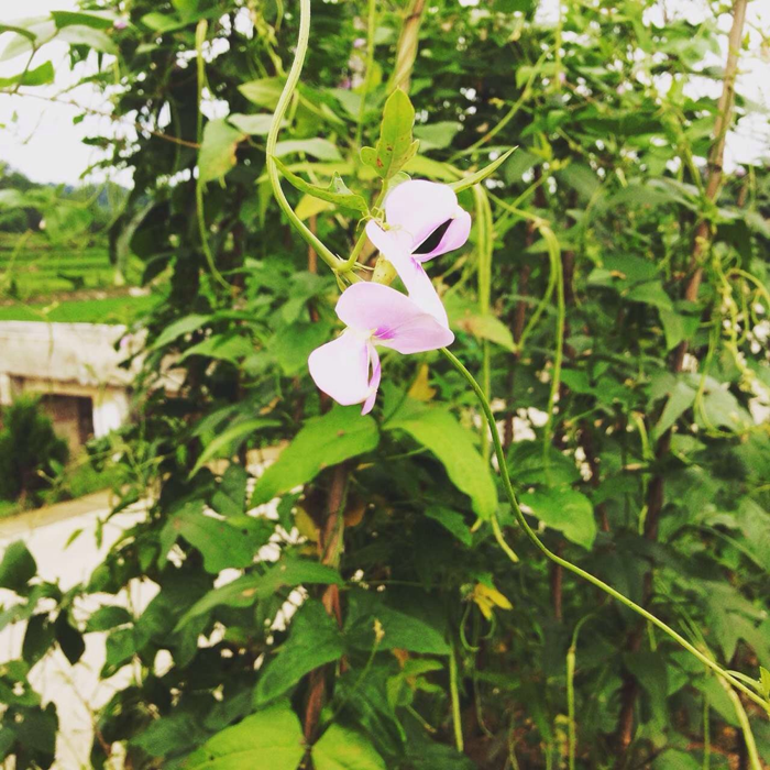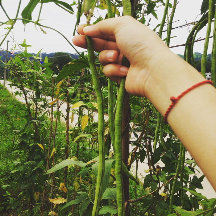 上午,太阳还不那么热烈的时候,按耐不住一颗好奇的心,跟着亲戚一起去了他们家的小菜园,中途学着亲戚的动作自己也摘了一把豇豆。