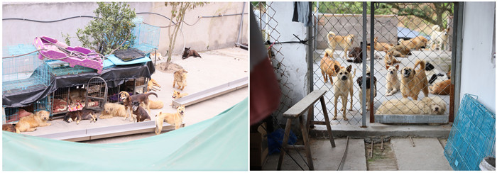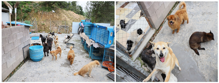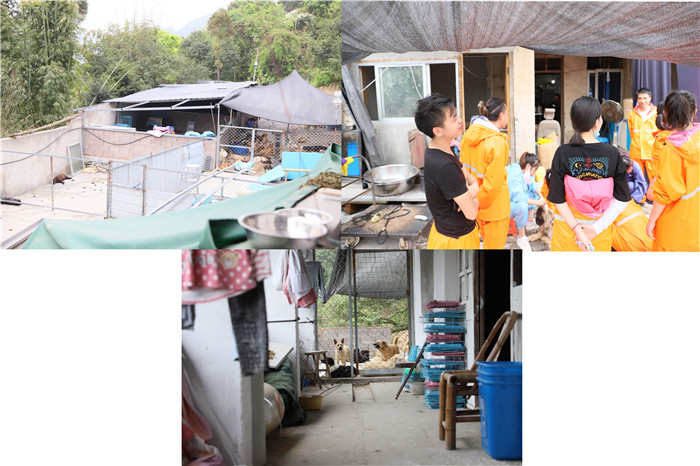 在清点过前一天采购的方便面、水果、饮用水、防护装备等物资后,2辆车从龙湾出发,1辆车鹿城出发,以及从平阳远道而来的王派机械小伙伴都准点出发,约定好10点在基地大门口集合,9点30分左右人员基本到齐。 基地每周固定的志愿者先于我们进入大门,而我们一行人站在门口等待换装时,就听到从大门里传来的一阵阵此起彼伏的犬吠声,仿佛是在迎接小编一行人的到来。 当小编一行人怀着激动而忐忑的心,小心翼翼打开大门,进入其中时,就看到一只黄色的小胖狗——安安好奇地看着我们,犹豫是否能抚摸小家伙时,小家伙已经贴上来求抚摸,还围着我们开心地转圈圈。 空气中弥漫着浓重的动物体味,带着口罩也无法抵挡味道侵入鼻腔。带着些许不适,一行人观察新基地的构成,一幢2层的老式民房,外加一个面积较大的庭院,狗狗的活动区域都在上方覆盖了一层吸热遮阳布,以免温度过高出现中暑情况。