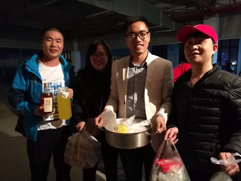 虽然看着非常多,但寒冷的夜晚加上在风雨中奔跑消耗了大量热量,大家全身湿漉漉的非常难熬。所需的一些物资也是先前没有准备到的。直到他们到来就像黑夜里的一道暖光照亮了大家:有担心大家着凉煮好姜茶,还特地嘱咐要买一些感冒冲剂的方总;带着袜子、椅子等用品来探望大家的和乐和乐阳等等。