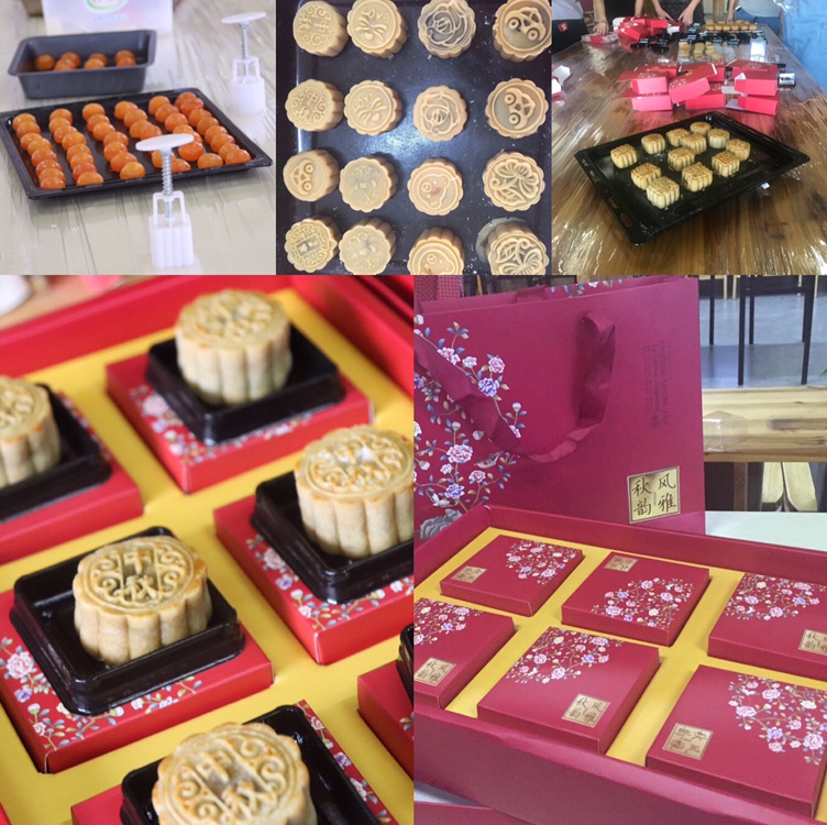 从准备饼皮、馅料到按压成型,包馅、打模、粘粉……一点点看着自己亲手制作的月饼渐渐成型......