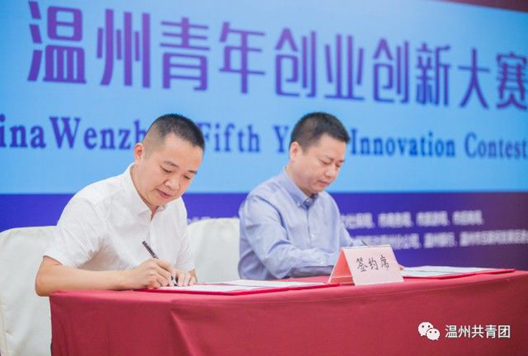共青团温州市委和温州银行举行金融支持项目签约仪式。温州银行将为参赛团队提供独家金融服务,包括2个亿的授信额度。