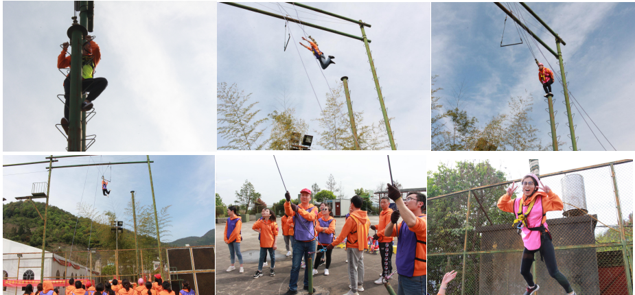 呼吸的力量协作项目。空中单杠项目时每个成员必须胆大心细、敢于挑战、相互鼓励、战胜恐惧心里,最终完成8米高空向前一跃。