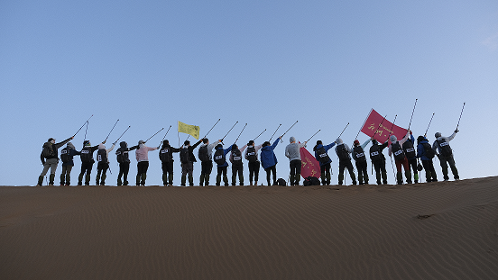第一次跟她见面,是冒这大雨,穿过省界来到她的面前。一望无际的黑,让我们感到十分的迷茫。但是身边小伙伴们的关怀,和热血激昂的致酒词,让我产生了一股油然而生的勇气和温暖。夜行沙漠,一个我曾经想都不敢想的词汇,而我现在正在进行着,并打算完成他,战胜他。头上带着头灯,手中拿着登山杖,一个接一个的小伙伴们跟紧着前人的步伐,努力的跟着队伍往前走。望眼看看四周,黑漆漆的一片,延着沙丘往上爬,只能走下一个人的宽度,有些害怕如果自己不小心滑倒,会不会就找不到了呢。但是前方和身后的小伙伴们,时不时的回个头,后面推一把,渐渐的将害怕驱逐,而是耐着心,专注的往前走,也时不时的帮帮身边的朋友,哪怕是用头顶上微弱的灯光帮他们照亮前方的路。