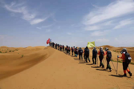 如果说夜行是一个小boss的话,那白天的徒步沙漠就是我们要攻克的一个终极大boss了吧。烈日当空,躲在帐篷里的我们都已经觉得十分的炎热,难以想象要怎么背着背包,载着3,4瓶的水行走的。不得不说没往前走一步的时候,我都觉得自己的体力在不断地流失,看着翻上翻下的越野车,脑子里的两个小人不断地在做着斗争, 一个在说坚持走下去,有什么我们是不行的呢,一个在说坐车都舒服呀,不用这么辛苦的爬着,走着。但是每次看到身边的小伙伴,有的越走越兴奋,有的再难受还咬牙坚持着,无论是哪种,都让我想要跟他们一起走到最后。