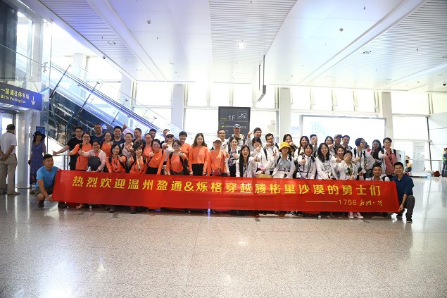 8月2日一早怀着忐忑的心情,和同事一起来到了温州机场。马上要经历一场前所未有的团建旅行。我们一行将进行为期5天的阿拉善腾格里沙漠徒步50公里穿越行。我们经过3个半小时的飞机颠簸后在银川机场和我们的领队1758的团队会合,大家在机场大厅里拍下了这次的第一张集体照。这时的我们每个人脸上都挂着兴奋好奇的笑脸。而后大巴车把我们一行43人带到了酒店里举行“破冰行动”仪式。我们两个公司混合在一起进行了分队,我和公司的3个同事和二楼盈通的同事组成了绿队。从这一刻起我们这11个人就是拴在一条线上的蚂蚱,谁也别想先跑,有难同当,有福同享。