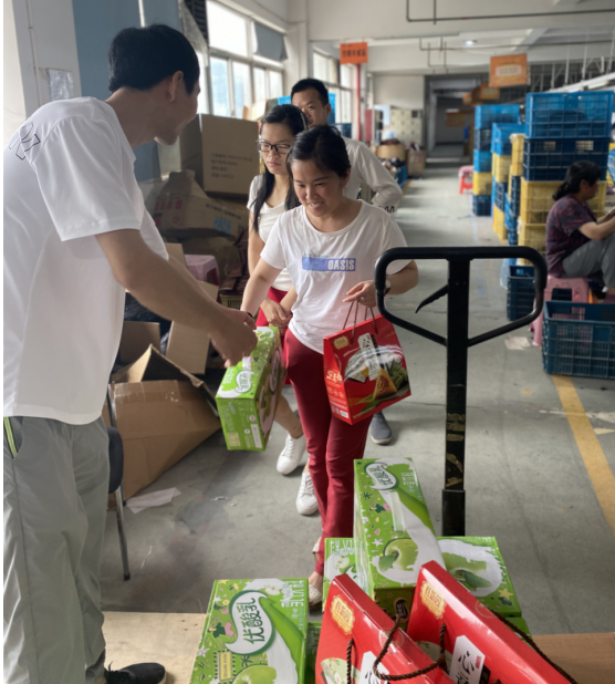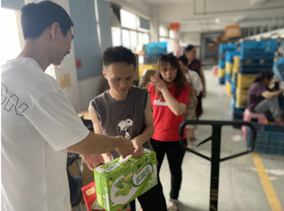 2021年6月4日上午,行政部门同事准备好车间福利,由车间管理亲自送给员工手上。