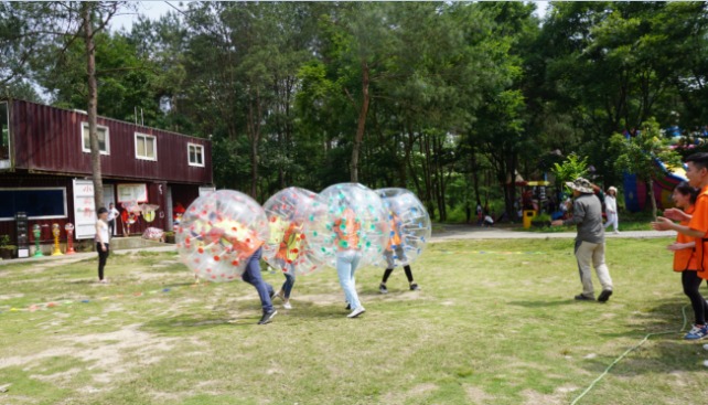 中午,大家集合在农家院。在美味佳肴中,大家互相交流情感。品尝完美味的食物后,来到江边露营基地,通过泡泡足球、真人弓箭等活动。