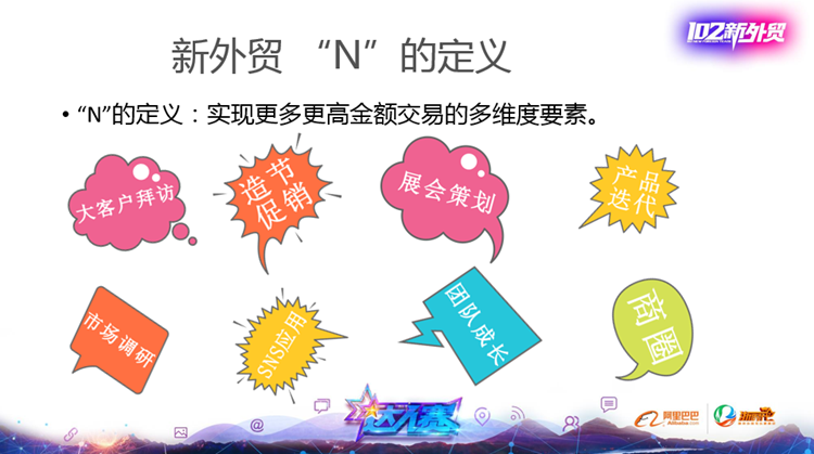我这次分享的课题是《1+N新外贸思维》,这里的“1”,指的是阿里巴巴在线交易,也就是通过走信保,沉淀更多的交易数据。“N”,就是指实现更高更多交易的多维度要素,例如:大客户拜访、造节促销、展会的策划、团队的成长等等。