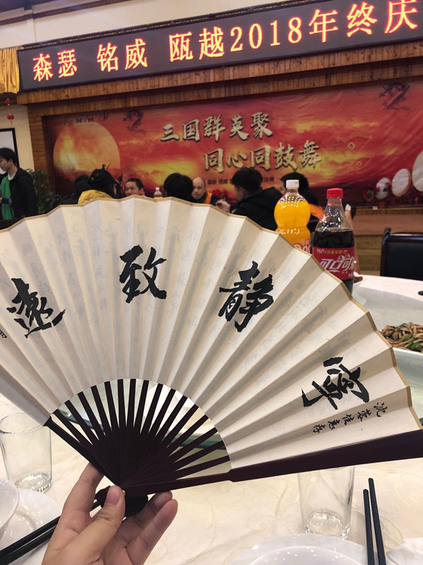 其实年会活动很促进大家之间的交流,也给我们留下了温暖的回忆,对于瓯越也是很难忘的回忆,面对强性竞争我们在自己的准则下努力,在困难中群策群力,在窘迫时互相支持,在激流中也可以用自己的方式温柔以待世界,每个成员都有自己独特的一面,我们既做到了和平共处,求同存异,又做到了互相学习,共同提升,感谢集体的力量。其实卧龙度假村的美景,还没有悠闲的看过,八卦村有一大片菜田,下雪的美景都没有拍,忙绿和疼痛让我们只能片刻领略身边的美,还想让大公堂的诸葛师傅为我题扇也没来得及,或许遗憾也很美好啦。留一点遗憾,未来的生活就多一份期待,期待2019,瓯越的成员们更加活力满满,更优秀。