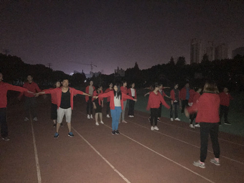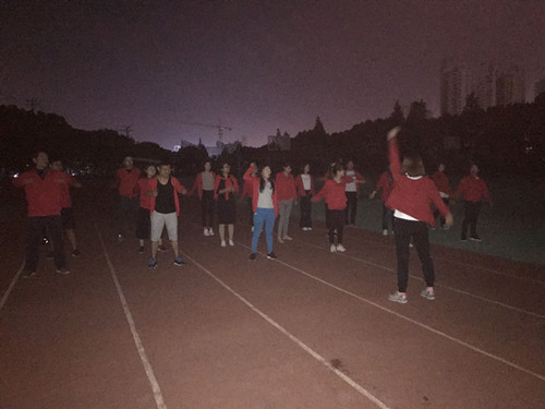 准备开始跑步之前我们的业务经理担任了我们的体育老师教我们热身