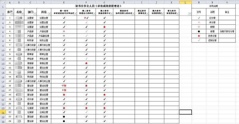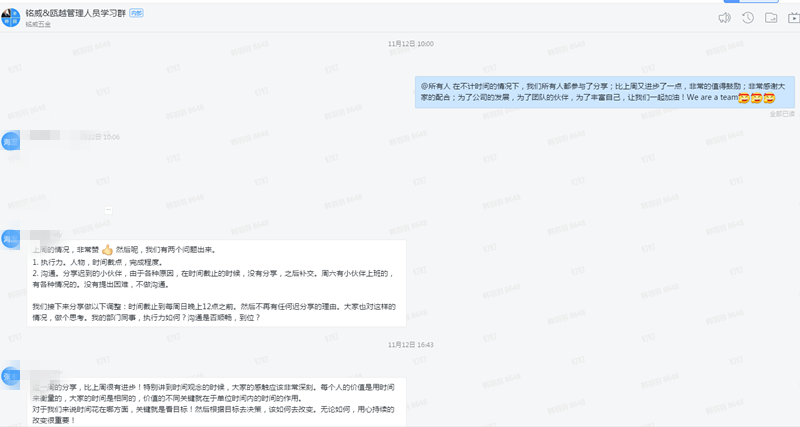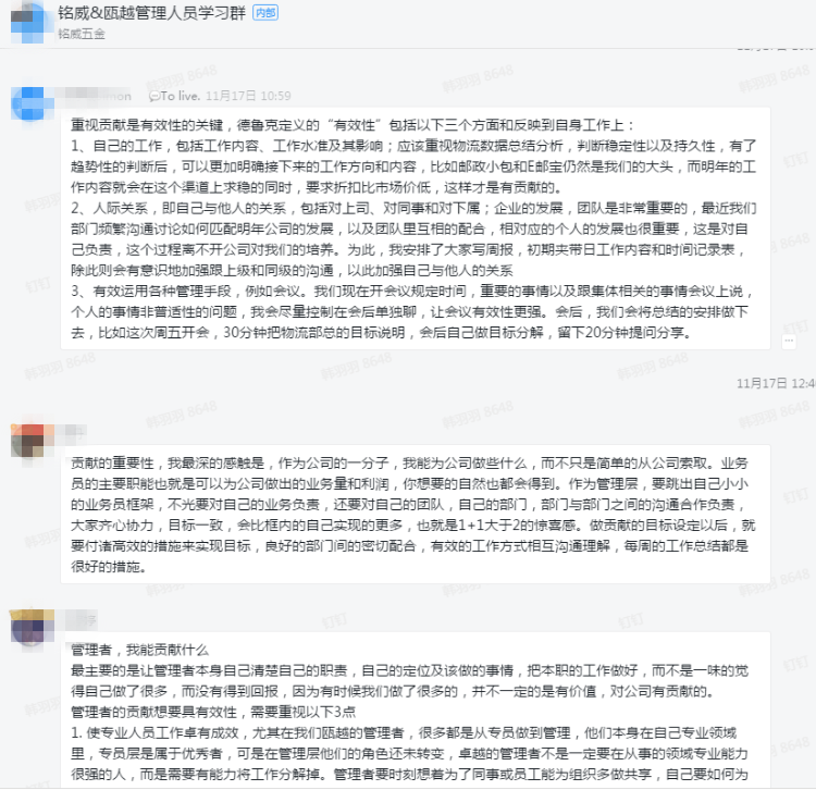 《卓有成效的管理者》共八章,我们将公司所有在职和管理人员和后备管理人员通过钉钉软件聚集到一个群里;通过每周看书一个章节并结合实际工作定期(每周末)进行分享,总结作为一个管理人员在岗位的不足和发展;提升各管理者的管理意识和方法。