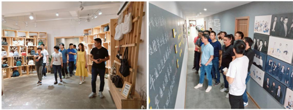 乐腾皮件的方总引导瓯越会成员参观并介绍公司整体环境,传达公司价值观、使命及理念,大家神情专注,仔细聆听。