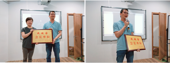 瓯越会实行会长职务年度换届制,由于第六任会长——铭威张总因事务无法出席此次交流会,森瑟光学的潘总代其将会长单位牌匾郑重传递给盈通国际的蔡总。