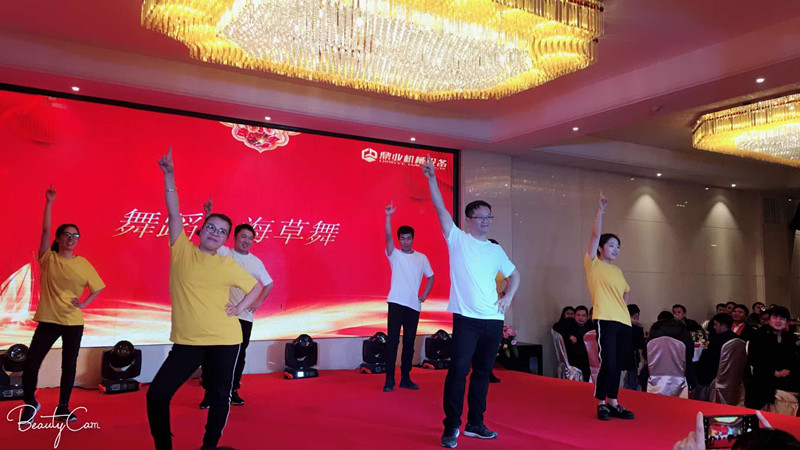 此次年会,恰逢公司要表彰十周年工龄奖这件事,各个部门的节目表演必不可少;我们外贸部节目有三,集体舞蹈“海草舞”,其中我站C位,如下图,呵呵;