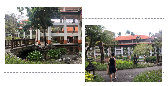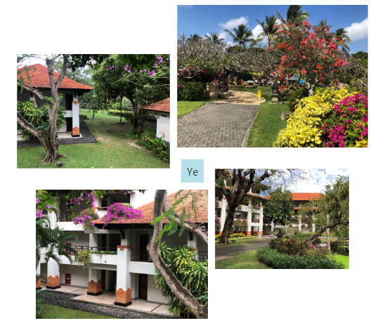 大厅院外,石径尽头,有一条长长的走廊,走过去是一个大院子,整整齐齐,由东到西,巴厘岛风格的建筑,房间颇多,可以供上千的住客居住。我们的房门前数棵不知名的大树,叶子被风吹落时,浓荫的覆盖一大片地。树上常有成群的野鸟住宿。早晨和黄昏,噪声闹嚷嚷的,有似一个嘈杂无序的未来派的音乐会。