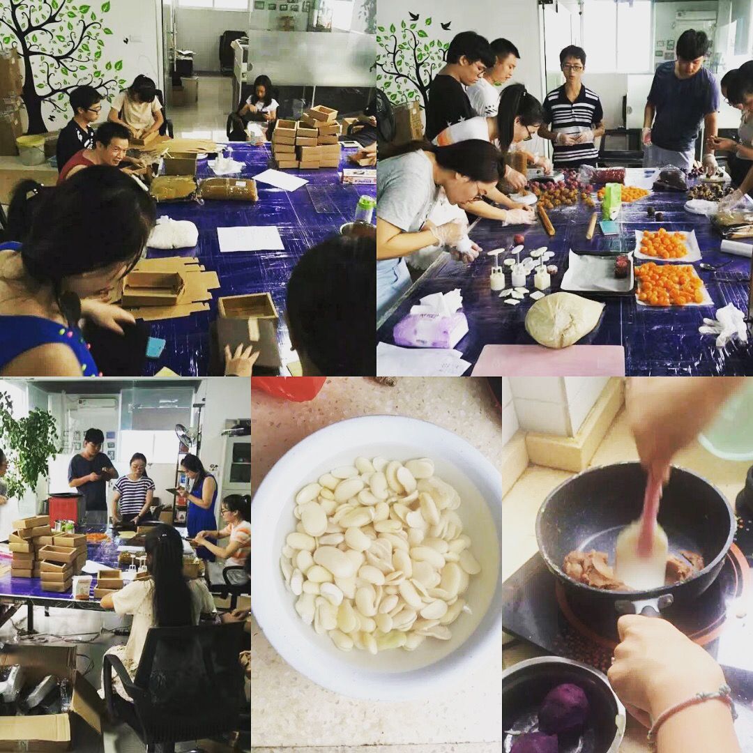现在月饼的品种也变得丰富多样起来。但是添加很多的防腐剂一点都不健康,所以我们自己做吧!最好的原料,无添加剂,加冰糖,纯手工制做,送亲戚,送同事,送客户!超赞!提前准备好了馅料,分工亲手洗了咸鸭蛋,烤好蛋黄,称好重量做准备,做好酥皮做好油皮,一起擀面皮,一起包馅料,一起压月饼,还有一部分的人先折叠好的盒子,写好卡片,坐等烤好的月饼包装,大家一起体验一起参与的乐趣,真的很好!