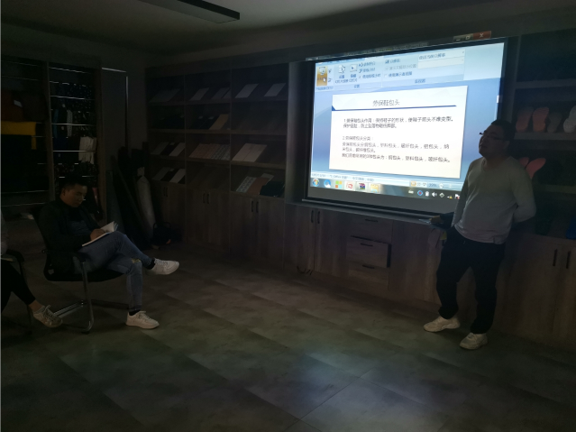 这个业务知识培训的主题是在和采购部的小伙伴们开会的时候提出来的,本以为会有反对的声音,但是采购部的小伙伴们非但没有反对的声音,而且各个都是大力支持。这个计划我们敲定后,采购部的伙伴们就开始各种课程,收集各种资料!PPT等!大家的这种积极让我感到我们的烁格大家庭是个非常有爱非常温暖 的大家庭!我们计划是第一场培训预计在11月10日开始,但是采购部小伙伴们的高效率,我们的第一堂材料培训从11月4日开始了!大家准时在下午5点相聚在大会议室!听着采购部杨民为大家介绍的PPT的材料产品知识,实物材料讲解让大家更深入的了解到包头更多的功能性!皮的各种特质!大家听得聚精会神!有了杨民的开头,接下来我们的茂哥给大家讲解了牛皮是在牛的哪个部位让我们记忆犹新。材料的培训后又迎来了王师傅和小建的机器讲解!什么样的机器需要什么样的配件。又让我们长了知识。有了机器那更少不了华哥的模具讲解!各种鞋子模型的模具经过机器材料一双整体的鞋子就完成了,让我突然发现简单的一双穿在脚上的鞋子居然需要那么多道工序!